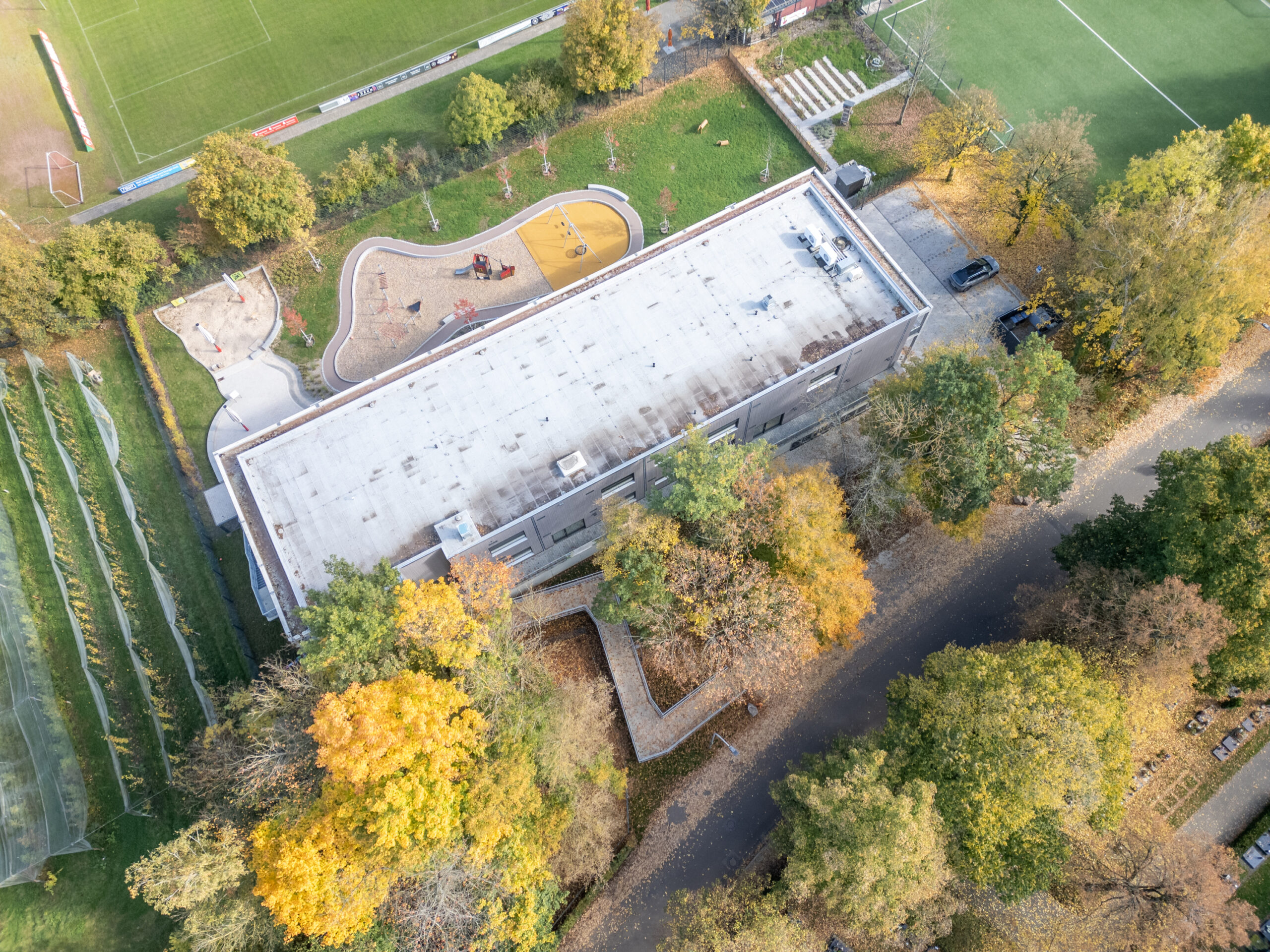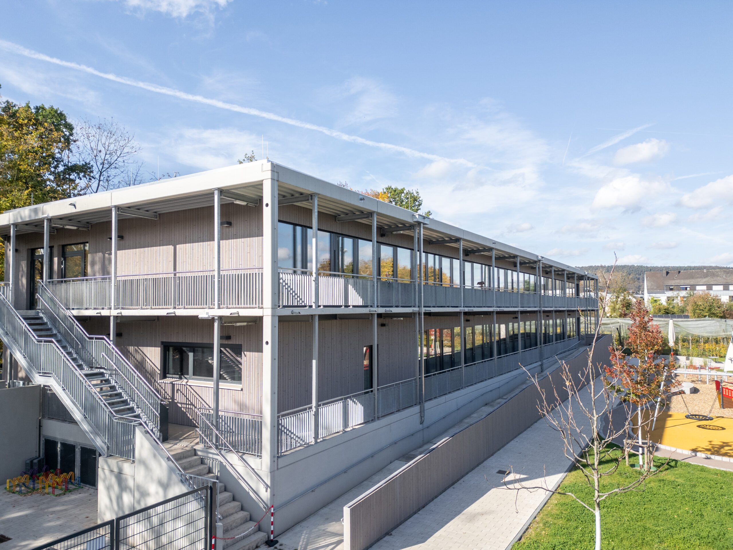 Der zweigeschossige Neubau mit Flachdach wurde in Holzsystembauweise errichtet. Um den bestehenden Baumbestand zu erhalten, wurde das Gebäude von der Straße abgerückt.