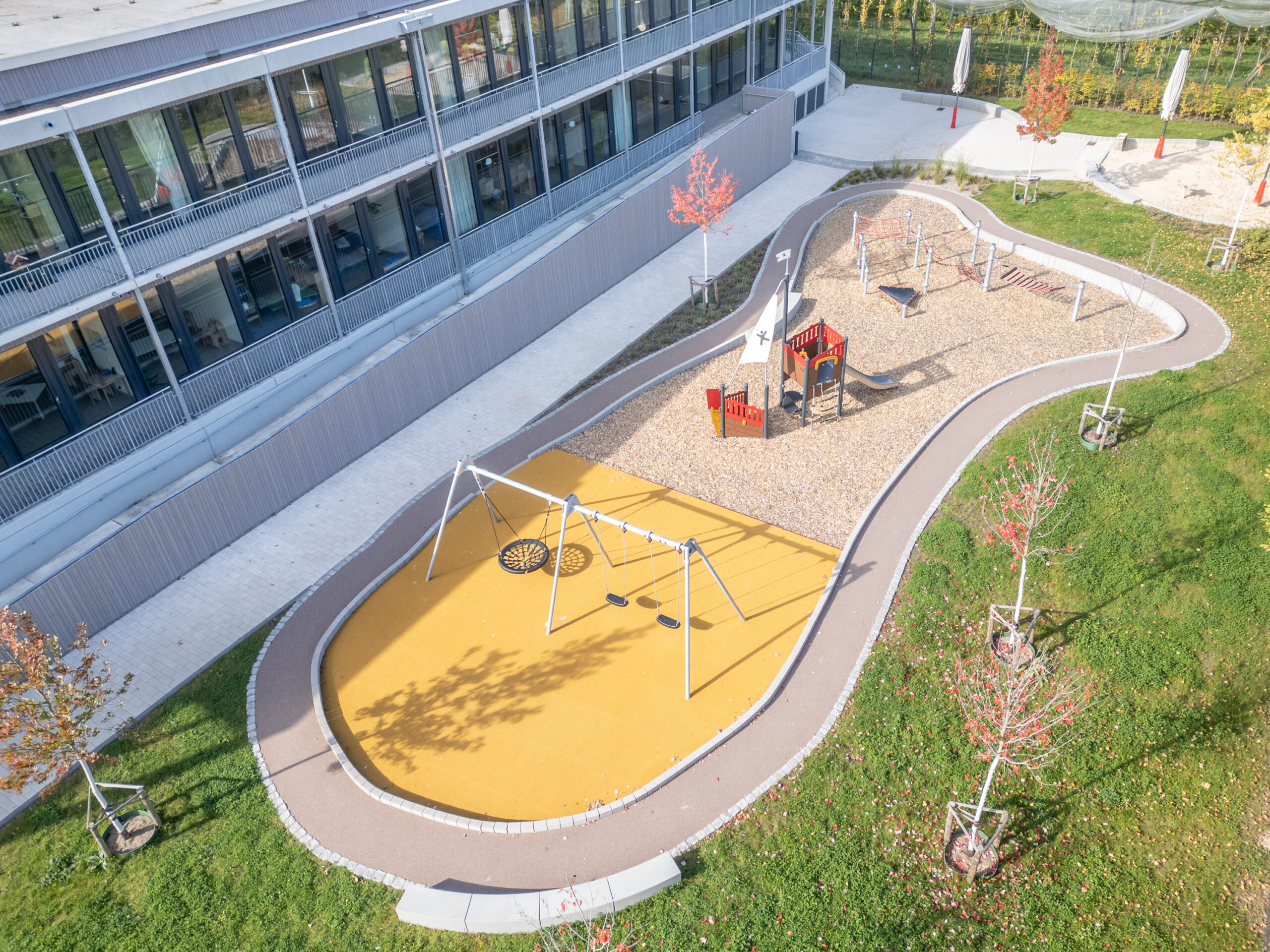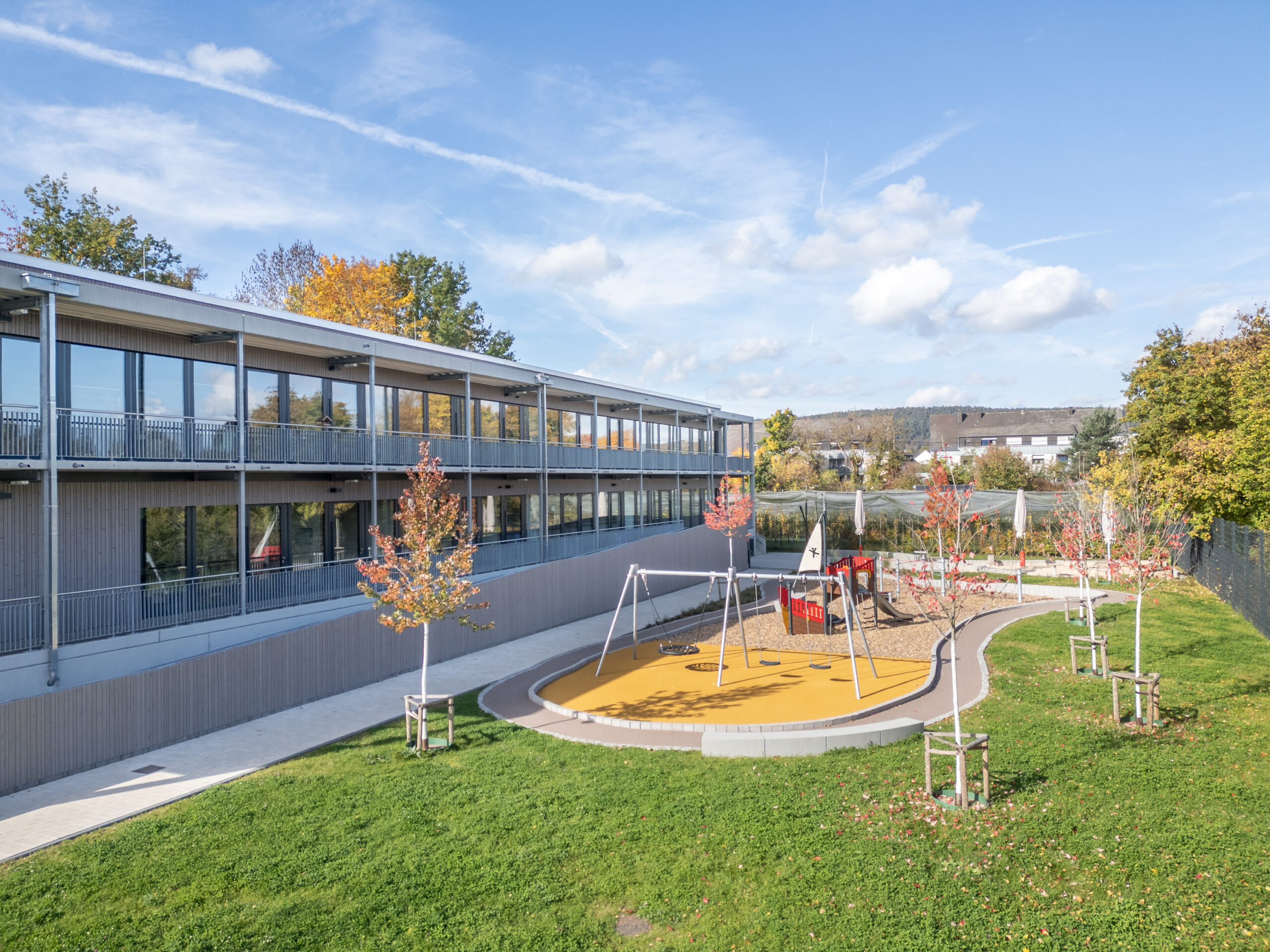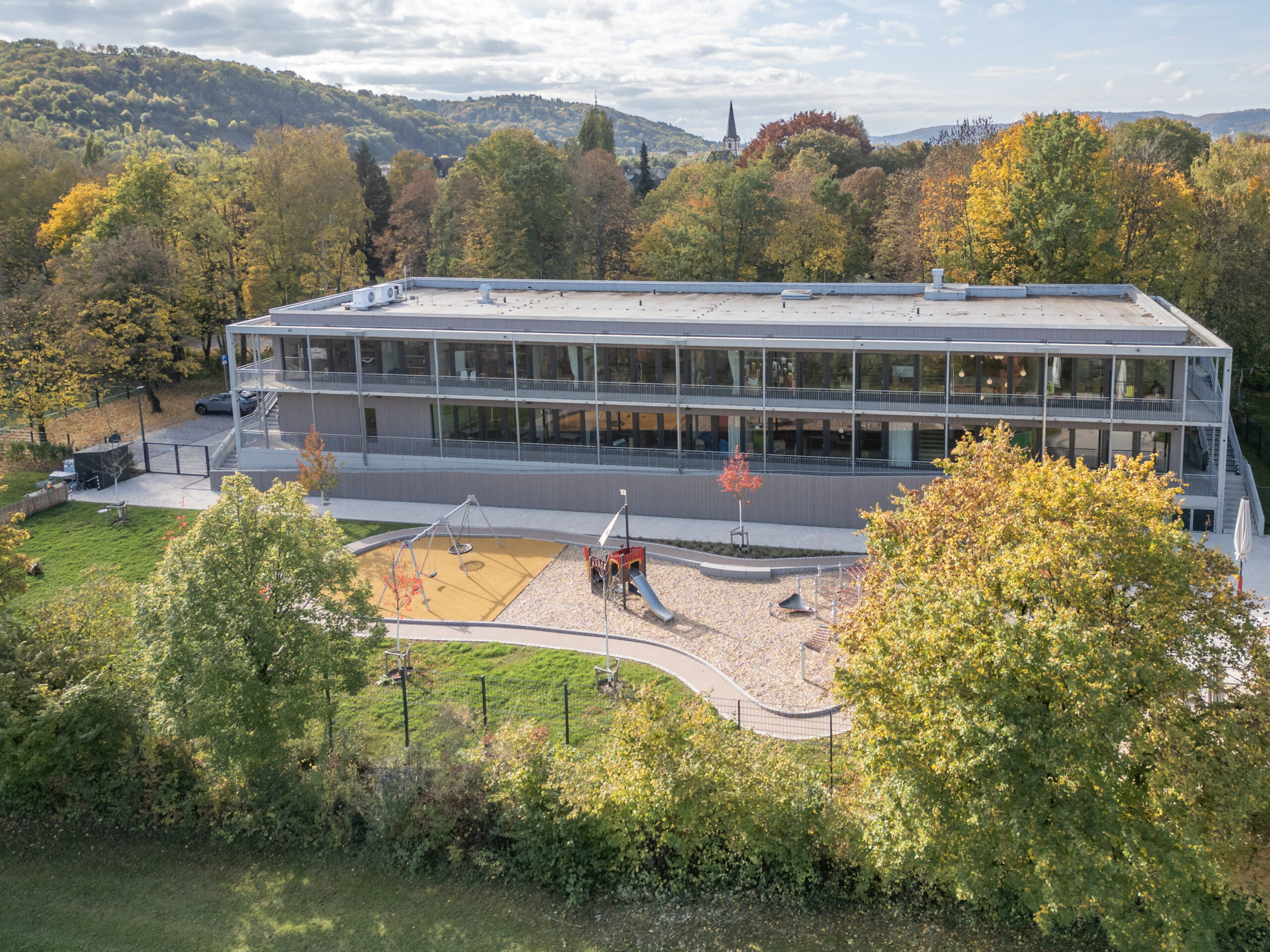 In Trier-Pfalzel entstand der Neubau der Kindertagesstätte St. Adula. Die 7-gruppige Einrichtung umfasst Gruppenräume, einen Mehrzweckraum, ein Foyer sowie eine Frischeküche. Das Gebäudekonzept basierte auf einem Wettbewerbsentwurf für die Stadt Trier und wurde auf das Raumprogramm in Pfalzel angepasst.